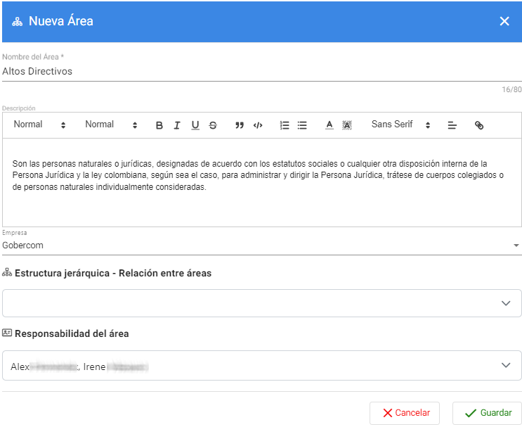 OrganizaciónÁreasÁreasPueden crearse las distintas áreas que componen nuestra empresa que queramos incluir en la herramenta.